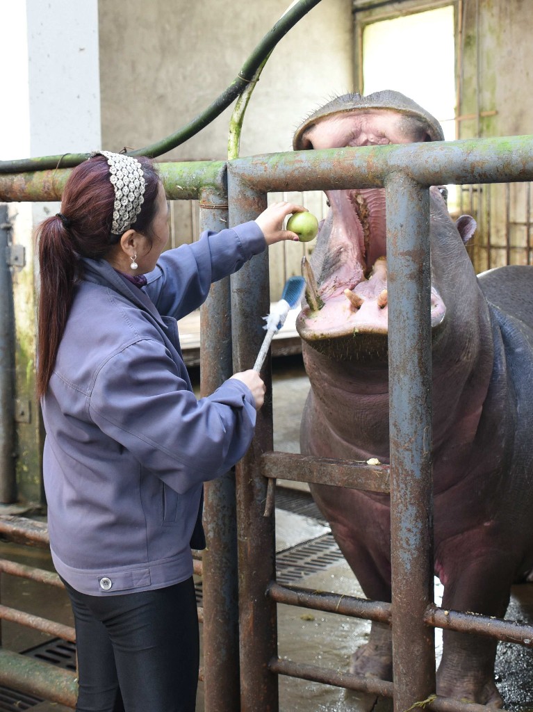 對于成年河馬除了身高體重測量,還要多加一項口腔檢查。看看那張陸生哺乳動物中最大的嘴里,口腔、牙齒是否健康。為更好觀察細節(jié)會先給河馬刷牙,河馬們對這種健康又舒適的特殊服務十分歡迎。