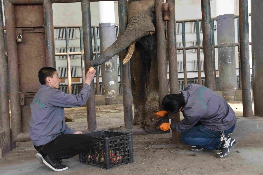 非洲象“豆豆”今年11歲,還在長身體。這次體檢發(fā)現(xiàn),一個冬天“豆豆”個子長了6cm,體重長了150kg,牙齒長長,腿長粗,腳也長大了。更讓“豆豆”喜歡的是,量完腳還有專業(yè)的修腳服務。
