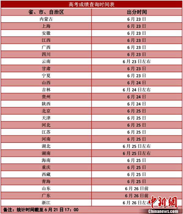 根據各省份此前公布的時間,6月23日起各地將陸續(xù)公布高考成績,查分時間主要集中在23至26日。