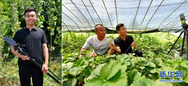 拼版照片:左圖為張成蘊在山西省運城市絳縣臨澮村的田間;右圖為張成蘊(右)在大棚里錄制農(nóng)業(yè)科普視頻(7月14日攝)。今年34歲的張成蘊大學畢業(yè)后,一直熱衷于用拍攝視頻的方式宣傳家鄉(xiāng)的風土人情。2018年8月,他開始在社交平臺上幫助鄉(xiāng)親們直播帶貨,真誠的笑容、優(yōu)質(zhì)的產(chǎn)品和專業(yè)的知識是他吸引粉絲的“訣竅”。