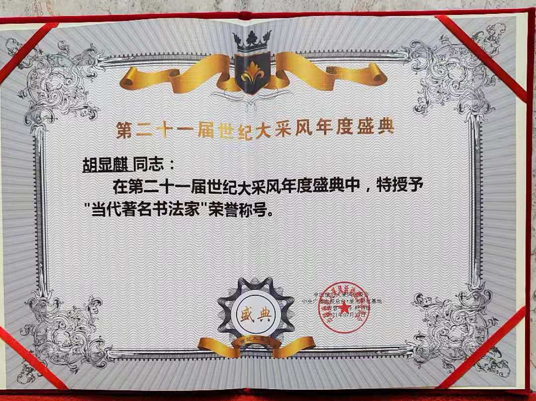 在第二十一屆世紀(jì)大采風(fēng)年度盛典中,特授予“當(dāng)代著名書(shū)法家”榮譽(yù)稱號(hào),多次參加在海南三亞和北京全國(guó)政協(xié)大禮堂舉行的頒獎(jiǎng)典禮。
