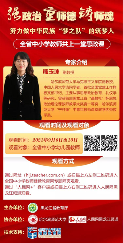 據(jù)了解,自9月6日至10日省教育廳將組織開展“全省中小學(xué)教師共上一堂思政課”活動(dòng),將邀請(qǐng)專家學(xué)者就提升思想政治素質(zhì)和師德水平、更好擔(dān)負(fù)起立德樹人根本任務(wù)為全省中小學(xué)教師授課。本次活動(dòng)將以線上課堂形式舉辦。參加人員通過全國(guó)中小學(xué)教師繼續(xù)教育網(wǎng)專題網(wǎng)頁收聽收看。