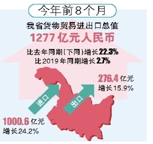 黑龍江日報訊(黑龍江日報全媒體記者 付宇)記者從哈爾濱海關(guān)獲悉,今年前8個月,我省貨物貿(mào)易進出口總值1277億元人民幣,比去年同期(下同)增長22.3%,比2019年同期增長2.7%。其中,出口276.4億元,增長15.9%;進口1000.6億元,增長24.2%。