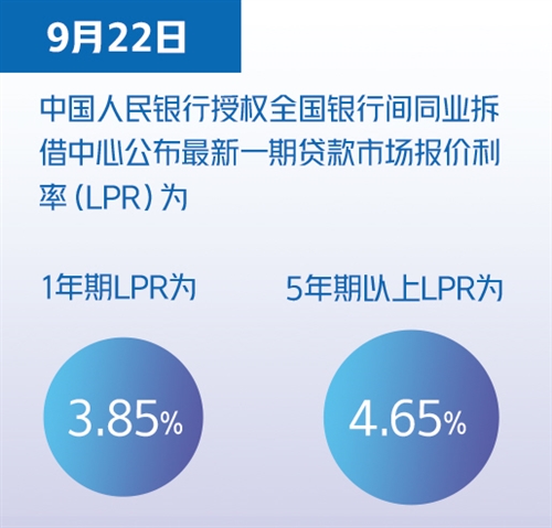 9月22日,中國人民銀行授權(quán)全國銀行間同業(yè)拆借中心公布最新一期貸款市場報價利率(LPR)為:1年期LPR為3.85%,5年期以上LPR為4.65%。兩項貸款市場報價利率均連續(xù)18個月保持這一水平。