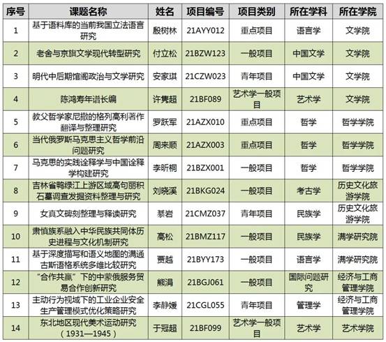 據(jù)了解,國家社會科學基金項目是經(jīng)國務院批準設立,由全國哲學社會科學工作辦公室負責管理,人文社科研究領域中層次最高、資助力度最大、權(quán)威性最強的國家級項目,受到學界高度關注。今年黑龍江大學立項的項目總體上有以下幾個特點:一是傳統(tǒng)優(yōu)勢學科立項數(shù)量穩(wěn)定增長。中國語言文學獲得4項,哲學獲得3項,與去年比較穩(wěn)中有升,保持了良好的科研發(fā)展態(tài)勢。二是特色學科亮點突出。考古學、民族學、國際問題研究、管理學等學科善于抓住熱點和難點問題,歷年均有斬獲;藝術學獲得2項一般項目,立項數(shù)居全省第一位,實現(xiàn)歷史性突破。三是高層次項目數(shù)量全省領先。全省共獲重點項目4項,黑大獲得其中3項,立項數(shù)占全省總量的75%。國家社科基金重點項目主要資助學術分量厚重、創(chuàng)新性強、對學科發(fā)展具有重要推動作用的研究成果。重點項目數(shù)量僅為每年立項總數(shù)的8%左右,是衡量科研單位科研能力和水平的重要標志,在各類評估、評比中具有較大權(quán)重。四是青年項目占比提高。從項目層次分布上來看,獲3項青年項目,占立項總數(shù)的21.4%,居十年來最高水平。