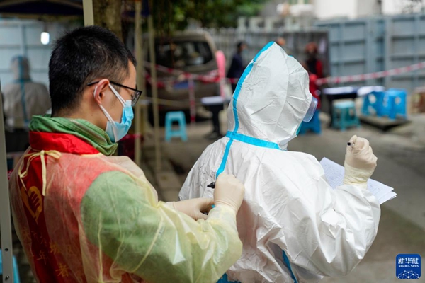 11月4日,在重慶九龍坡區(qū)九龍街道,一名青年志愿者在同伴的防護(hù)服上寫(xiě)上姓名。
