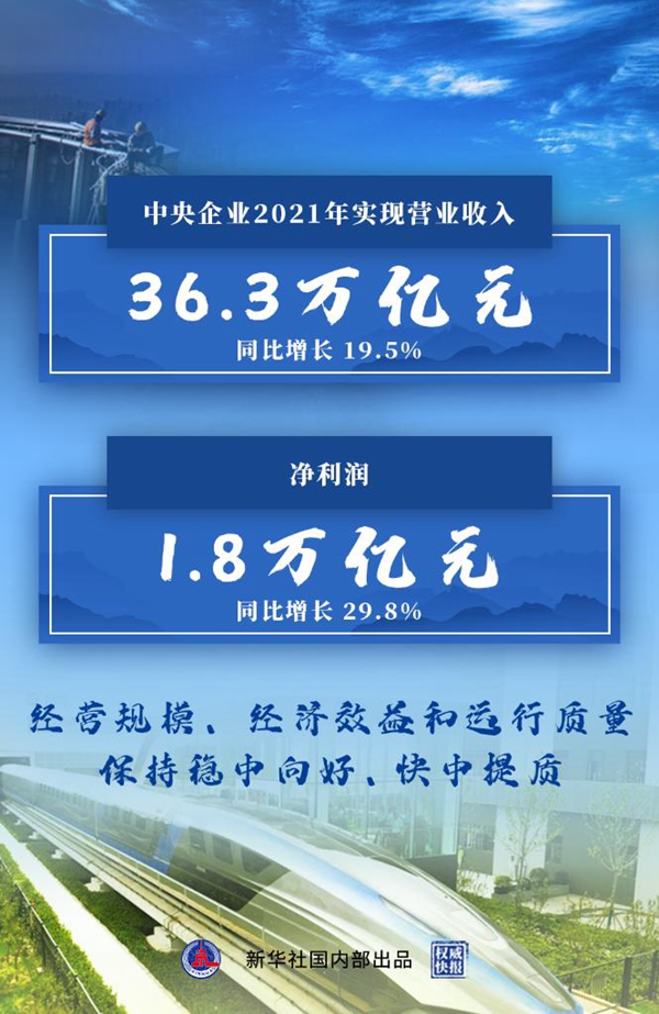 2021年,中央企業(yè)完成固定資產(chǎn)投資(不含房地產(chǎn))3.2萬(wàn)億元,同比增長(zhǎng)10.1%;上繳稅費(fèi)2.4萬(wàn)億元,同比增長(zhǎng)20%;截至去年末中央企業(yè)資產(chǎn)負(fù)債率保持在64.9%,圓滿完成預(yù)期目標(biāo)。