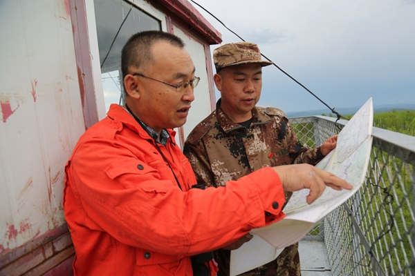 孫立森在向長(zhǎng)山林場(chǎng)黨支部書記關(guān)大安介紹塔周圍的地形、地勢(shì)、河流等特點(diǎn),以及周邊瞭望塔的分布情況(王力 攝)