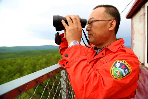 阿木爾林業(yè)局“阿16”防火瞭望塔瞭望員孫立森密切關(guān)注周圍森林資源安全(王力 攝)