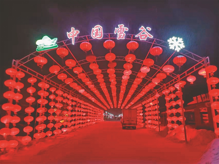 當(dāng)我們抵達(dá)雪谷的時(shí)候,暮色已濃,天地間覆蓋了一片黑色的幕布。但雪谷中心街道上,聳立著由上千只大紅燈籠排列組合的拱形門,燈火輝煌,延續(xù)百米開外。門的頂端中央鑲嵌著“中國雪谷”四個(gè)金色大字,格外醒目。我們停下車拍照,并就近住宿,溫暖的火炕讓我們很快進(jìn)入夢(mèng)鄉(xiāng)。