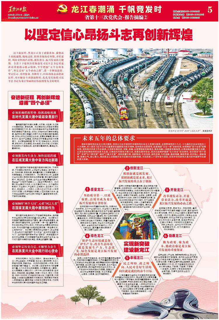 邁上新征程,黑龍江正處于政策疊加、乘勢而上的機(jī)遇期,爬坡過坎、轉(zhuǎn)型升級(jí)的攻堅(jiān)期,矛盾累積、風(fēng)險(xiǎn)交織的凸顯期,激發(fā)潛力、振興發(fā)展的關(guān)鍵期。全省上下要堅(jiān)決貫徹落實(shí)習(xí)近平總書記重要講話重要指示批示精神,牢牢把握“五個(gè)有利條件”,堅(jiān)定走好“五個(gè)必由之路”,進(jìn)一步解放思想、堅(jiān)定信心、勇?lián)姑?、真抓?shí)干,以昂揚(yáng)姿態(tài)奮進(jìn)新征程,用不懈奮斗再創(chuàng)新輝煌,扎扎實(shí)實(shí)地把習(xí)近平總書記為龍江擘畫的宏偉藍(lán)圖變?yōu)槊篮矛F(xiàn)實(shí)。