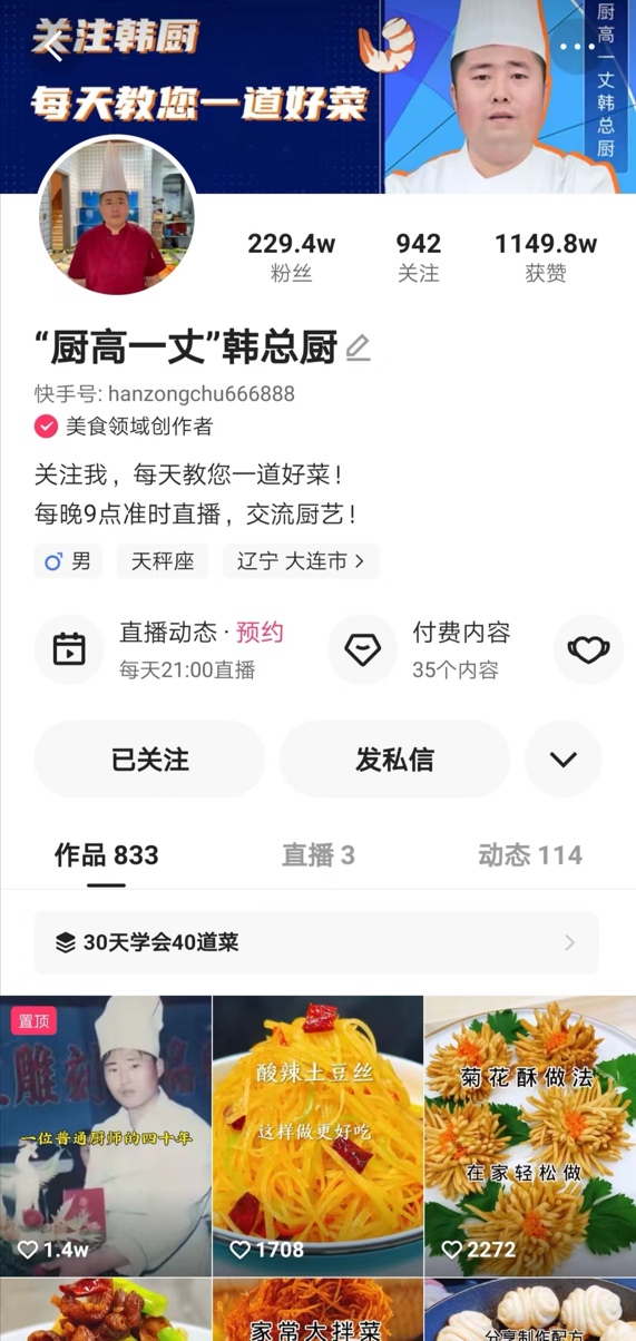 “我只想踏踏實(shí)實(shí)地教大家做菜,粉絲們只要跟著我的課程一步步做,做出的菜品味道絕不會(huì)差?!睆臐M足粉絲的需求出發(fā),韓總廚憑借一條條制作精良、干貨滿滿的視頻課程,積累了229.4萬粉絲,榮升成粉絲心目中的“老大”。