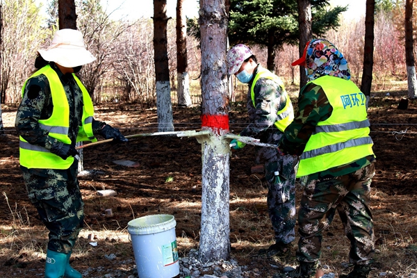 阿木爾林業(yè)局環(huán)衛(wèi)工為道路兩側綠化樹木涂抹防啃劑,保護生態(tài),美化環(huán)境(王力 攝)