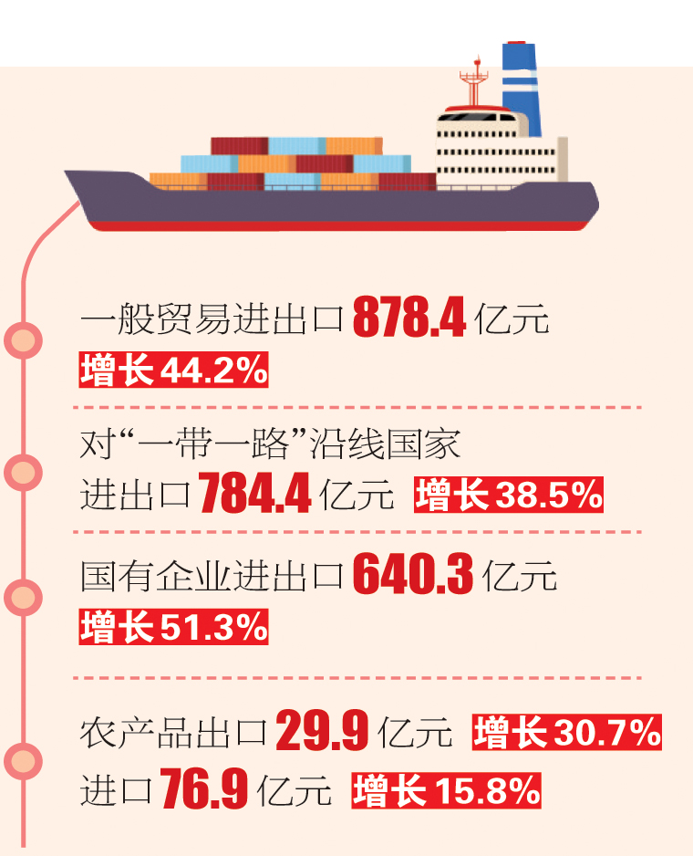 一般貿(mào)易進(jìn)出口878.4億元,增長44.2%,占全省外貿(mào)總值的87.3%,比去年同期提升5.7個百分點(diǎn)。邊境小額貿(mào)易進(jìn)出口80.3億元,增長1.6%,占全省外貿(mào)總值的8%。加工貿(mào)易進(jìn)出口32.4億元,下降3.7%,占全省外貿(mào)總值的3.2%。