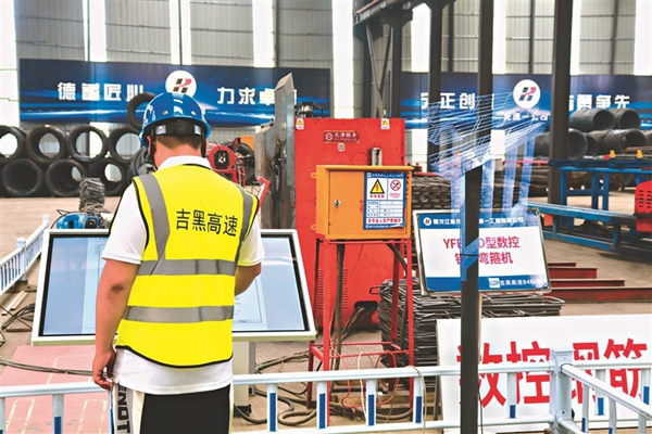 鋼筋加工車間里一處3D立體投影,讓工人們可以直觀看到自己加工后的構(gòu)件將用于整體鋼筋骨架的哪個部位。任書法說,吉黑高速項(xiàng)目打造智慧梁廠,采用了數(shù)控鋼筋滾焊機(jī)、數(shù)控鋼筋剪切生產(chǎn)線、數(shù)控鋼筋彎曲中心+自動上料配套等設(shè)備,以前這么大的加工廠要30多人,現(xiàn)在只需一半的人力,就能干出兩倍的工作量,極大提高了施工精度和效率。