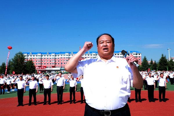 青年黨員母立巖手舉黨旗健步跑向藍(lán)莓廣場(chǎng)主席臺(tái),把黨旗交到了林業(yè)局黨委書(shū)記胡守慶手中,胡守慶揮舞黨旗,臺(tái)下黨員齊聲說(shuō)道:“不忘初心、牢記使命”。