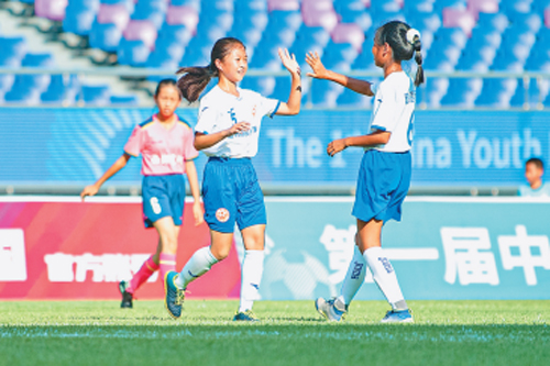 7月10日,在第一屆中國青少年足球聯(lián)賽(浙江賽區(qū))女子小學(xué)U12組比賽中,杭州長陽小學(xué)的小球員彭紫萱(中)進球后與隊友鄧語菲擊掌慶祝。