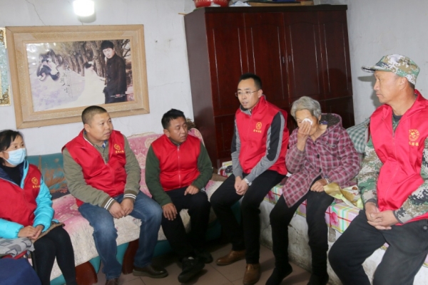接著大家又來到明桂琴和程少和老人家中。在明桂琴老人家中,黨員同志們一走進院子,正趕上老人家中的糧食沒有碼放好灑了一地,大家立刻七手八腳的把糧食收好裝入袋中。在隨后的座談慰問中,老人回想起這些年工作隊的同志們對自己的熱心幫扶,感動得熱淚盈眶。