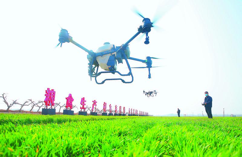 3月1日,鶴壁市??h王莊鎮(zhèn)小灘村,種糧大戶魏方月的2000畝小麥喝上了“返青水”,同時,無人機(jī)在空中施肥,播撒均勻效率還高。