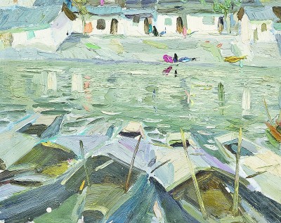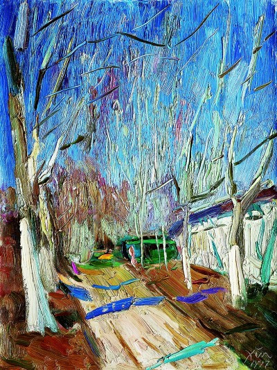 在諶北新的代表性作品里,無論何種結(jié)構(gòu),色調(diào)、筆觸、造型、線條都可以獨(dú)立觀賞。一塊厚堆的白色顏料,可以是云朵、是白墻,或是前后重疊的船帆。用筆的疏密、狀貌和節(jié)奏都有獨(dú)立存在的意義,既可以像欣賞書法用筆一樣拋開物象去體味,又可以去想象和填補(bǔ)與之恰合的物象和自然關(guān)系。諶北新對(duì)書法的深入研究和長(zhǎng)期的繪畫寫生,以及他對(duì)物象、空間、色彩關(guān)系的觀察與創(chuàng)造實(shí)踐,使其作品能夠?qū)⒉煌谋憩F(xiàn)手法有機(jī)地融為一體。比如一筆畫下去,既表現(xiàn)空間層次,也體現(xiàn)厚薄輕重,同時(shí)展現(xiàn)光線的微妙變化。這種綜合性的呈現(xiàn)效果,實(shí)際上也契合著中國(guó)山水畫所追求的通過用筆的輕重緩急,通過虛實(shí)濃淡的墨色渲染,通過遠(yuǎn)近高低的畫面布局,表現(xiàn)山水對(duì)人的情感與心靈的影響。而諶北新的風(fēng)景油畫,正是基于中國(guó)人對(duì)山川草木的喜愛之情,通過體察和探求提煉出的獨(dú)特意象,它符合現(xiàn)代人的心理需求,也呼應(yīng)著畫家畢生追求的藝術(shù)境界——須其自來,不以力構(gòu)。