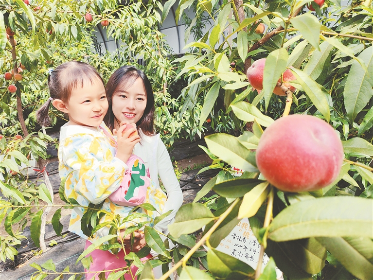 “我認(rèn)養(yǎng)了一棵桃樹(shù),今天和妻子共同看看桃子的長(zhǎng)勢(shì),過(guò)些天就可以親自采摘了?!标P(guān)勇和妻子正在查看認(rèn)養(yǎng)的桃樹(shù)。