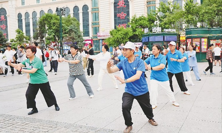 在哈爾濱建筑藝術廣場上,可以看到來自各地的游人正在打卡拍照,來自青島的老年旅游團還在此打起了太極拳。據(jù)同程旅行發(fā)布的《2024暑運出行趨勢報告》,自6月份以來,哈爾濱成為這個暑期熱門避暑目的地,6月中旬開始,黑龍江的人氣快速上升。本報記者 張澍攝