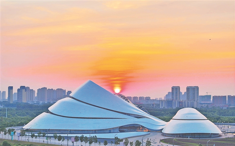 晚霞掩映下的哈爾濱大劇院。