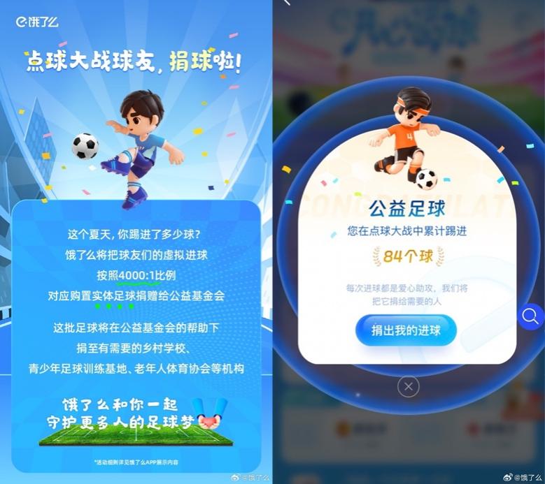 在西班牙隊(duì)球迷的歡呼聲中歐洲杯正式落幕,隨之結(jié)束的還有餓了么足球季活動(dòng)。7月15日當(dāng)天,餓了么官宣上線足球捐贈(zèng)活動(dòng),所有用戶都可以選擇捐贈(zèng)這一個(gè)月來(lái)在“點(diǎn)球大戰(zhàn)”游戲中累積的虛擬進(jìn)球,餓了么將聯(lián)合公益基金會(huì),按照比例對(duì)應(yīng)捐贈(zèng)實(shí)物足球給到有需要的鄉(xiāng)村學(xué)校、青少年足球訓(xùn)練基地、老年人體育協(xié)會(huì)等,和用戶一起把今夏開(kāi)心傳遞給更多人。