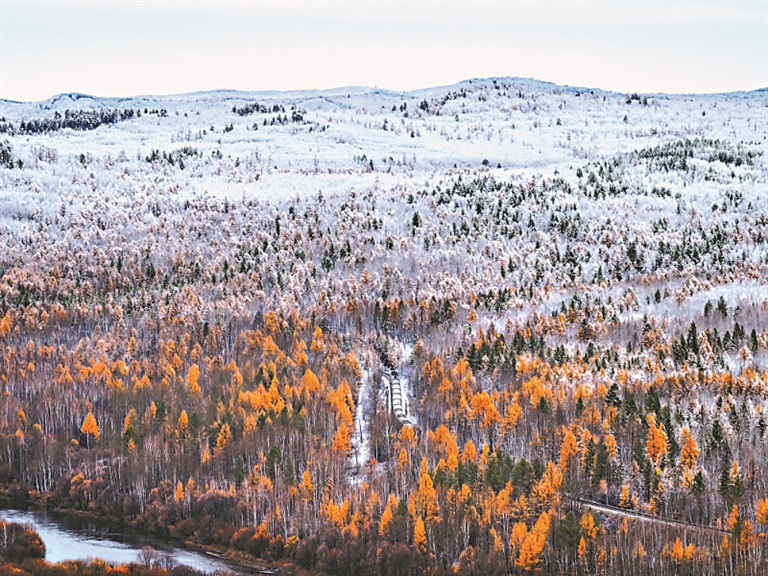 從空中俯瞰最北邊城儼然已經(jīng)進(jìn)入冬季。眼下正值漠河的金秋時(shí)節(jié),突如其來(lái)的降雪為北國(guó)秋色增添了別樣美景。松枝上布滿了厚厚的雪球,山林之間的秋色景觀與皚皚白雪同框,火車(chē)在白雪森林間穿行而過(guò),令南方游客驚嘆不已。本報(bào)記者 張磊攝