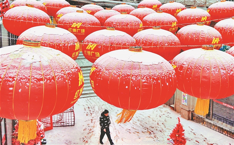 7日,臘八節(jié),哈爾濱市迎來降雪天氣。在白雪映襯下,街邊和廣場上懸掛的大紅燈籠更顯喜慶。街上的行人紛紛拿出手機(jī)拍下精彩瞬間。在一些市場內(nèi),銷售臘八粥、臘八蒜的攤位擠滿了消費(fèi)者,生意十分紅火。