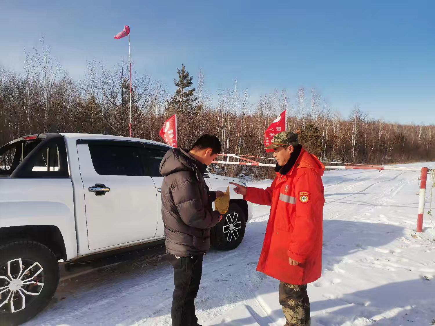 河口林場(chǎng)職工在檢查站為過(guò)往車輛發(fā)放宣傳單(趙子敬 攝)