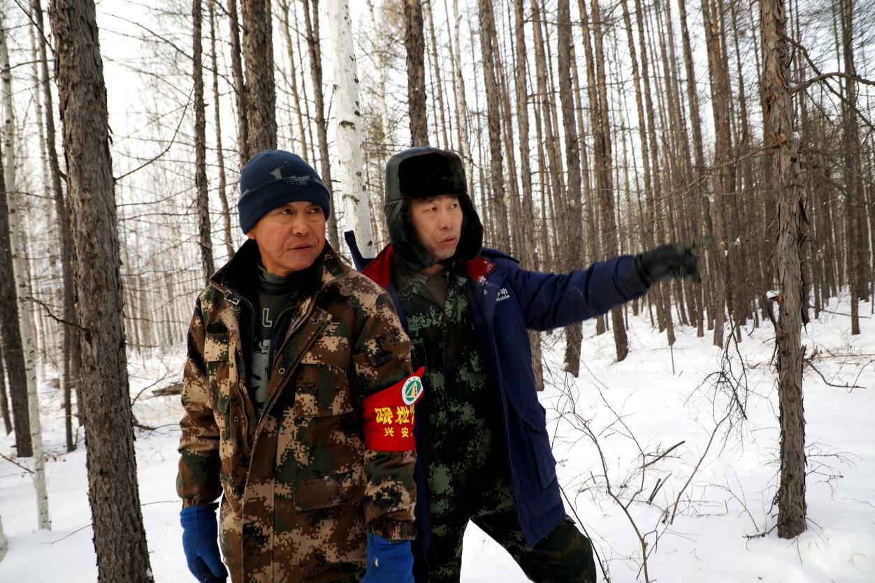 阿木爾林業(yè)局生態(tài)修復管理科驗收員劉明(右)跟班作業(yè)指導生產(王力 攝)